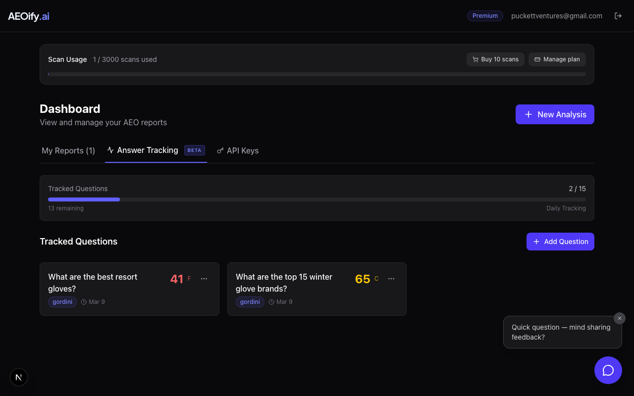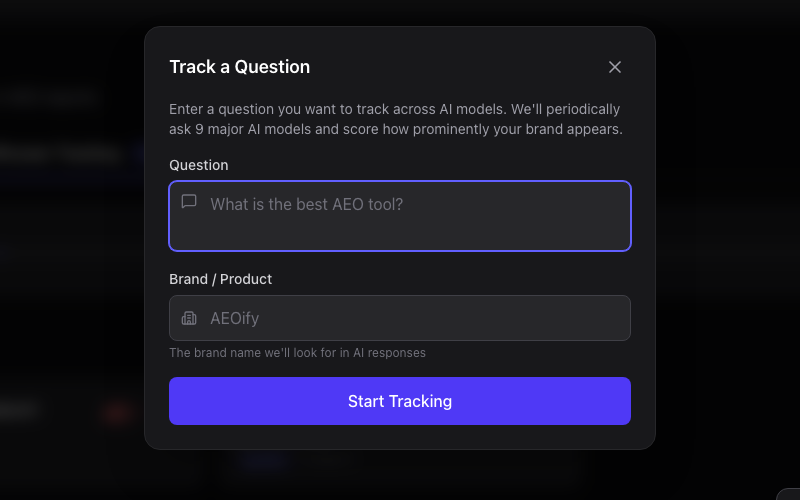 You add a question and your brand name. AEOify sends the question to multiple AI models, analyzes their responses for mentions of your brand, and calculates a visibility score. Results are stored so you can track trends over time.