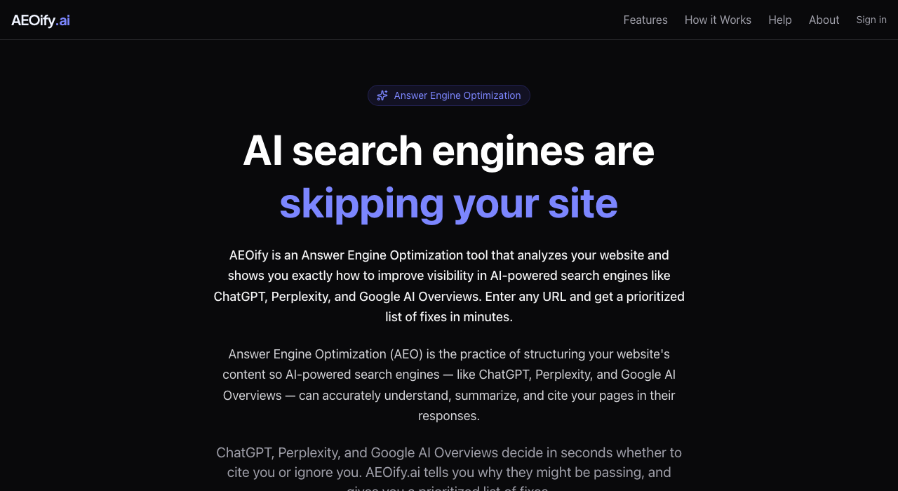 AEOify loads your pages in a real browser and evaluates each page against current AEO best practices. In smart scan mode, it follows internal links and auto-discovers your key pages. In single page mode, it analyzes only the URL you entered. See how AEOify works for the full process.