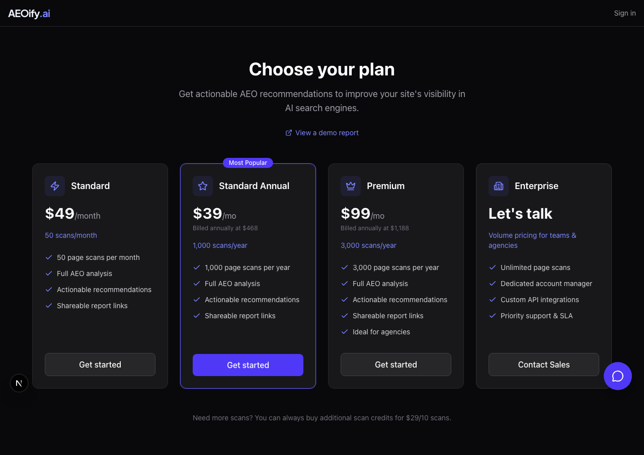 Enter a URL, pick a plan, and get your first AEO report in minutes.